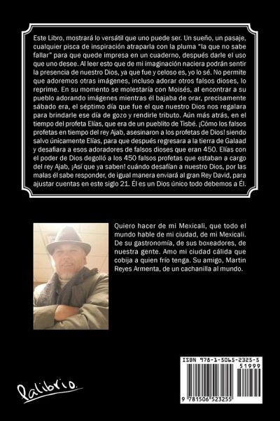 Este Libro, mostrará lo versátil que uno puede ser. Un sueño, un pasaje, cualquier pisca de inspiración atraparla con la pluma ?la que no sabe fallar? para que quede impresa en un cuaderno, después darle el uso que uno desee. Al leer esto que de mi imaginación naciera podrán sentir la presencia de nuestro Dios, ya que fue y celoso es, yo lo sé. No permite que adoremos otras imágenes, incluso adorar otros falsos dioses, lo reprime. En su momento se molestaría con Moisés, al encontrar a su pueblo adorando imágenes mientras él bajaba de orar, precisamente sábado era, el séptimo día que fue el que nuestro Dios nos regalara para brindarle ese día de gozo y rendirle tributo. Aún más atrás, en el tiempo del profeta Elías, que era de un pueblito de Tisbé. ¡Cómo los falsos profetas en tiempo del rey Ajab, asesinaron a los profetas de Dios! siendo salvo únicamente Elías, para que después regresara a la tierra de Galaad y desafiara a esos adoradores de falsos dioses que eran 450. Elías con el poder de Dios degolló a los 450 falsos profetas que estaban a cargo del rey Ajab, ¡Así que ya saben! cuándo desafían a nuestro Dios, por las malas él sabe responder, de igual manera enviará al gran Rey David, para ajustar cuentas en este siglo 21. Él es un Dios único todo debemos a Él.