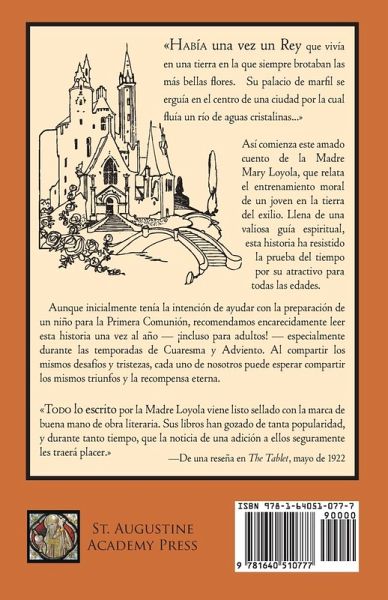 "Había una vez un Rey que vivía en una tierra en la que siempre brotaban las más bellas flores. Su palacio de marfil se erguía en el centro de una ciudad por la cual fluía un río de aguas cristalinas..." Así comienza este amado cuento de la Madre Mary Loyola, que relata el entrenamiento moral de un joven en la tierra del exilio. Llena de una valiosa guía espiritual, esta historia ha resistido la prueba del tiempo por su atractivo para todas las edades. Aunque inicialmente tenía la intención de ayudar con la preparación de un niño para la Primera Comunión, recomendamos encarecidamente leer esta historia una vez al año — ¡incluso para adultos! — especialmente durante las temporadas de Cuaresma y Adviento. Al compartir los mismos desafíos y tristezas, cada uno de nosotros puede esperar compartir los mismos triunfos y la recompensa eterna.