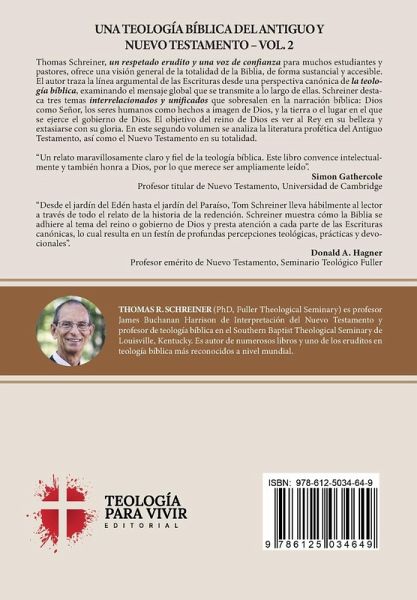 UNA TEOLOGÍA BÍBLICA DEL ANTIGUO Y NUEVO TESTAMENTO - VOL. 2 Thomas Schreiner, un respetado erudito y una voz de confianza para muchos estudiantes y pastores, ofrece una visión general de la totalidad de la Biblia, de forma sustancial y accesible. El autor traza la línea argumental de las Escrituras desde una perspectiva canónica de la teología bíblica, examinando el mensaje global que se transmite a lo largo de ellas. Schreiner destaca tres temas interrelacionados y unificados que sobresalen en la narración bíblica: Dios como Señor, los seres humanos como hechos a imagen de Dios, y la tierra o el lugar en el que se ejerce el gobierno de Dios. El objetivo del reino de Dios es ver al Rey en su belleza y extasiarse con su gloria. En este segundo volumen se analiza la literatura profética del Antiguo Testamento, y el Nuevo Testamento. "Un relato maravillosamente claro y fiel de la teología bíblica. Este libro convence intelectualmente y también honra a Dios, por lo que merece ser ampliamente leído". Simon Gathercole >"Desde el jardín del Edén hasta el jardín del Paraíso, Tom Schreiner lleva hábilmente al lector a través de todo el relato de la historia de la redención. Schreiner muestra cómo la Biblia se adhiere al tema del reino o gobierno de Dios y presta atención a cada parte de las Escrituras canónicas, lo cual resulta en un festín de profundas percepciones teológicas, prácticas y devocionales". Donald A. Hagner >"Si los lectores buscan las observaciones, en gran medida inductivas, de un académico y teólogo experimentado sobre las porciones más significativas desde el punto de vista teológico de cada libro bíblico, serán invitados a un delicioso festín con suficientes notas al pie de página que les sugerirán dónde pueden ir a comer el postre. . . Aunque [Schreiner] sería la última persona en desear que alguien lea su libro en lugar de la Biblia, una persona que posea un conocimiento apenas superficial del contenido y el significado de las Escrituras podría leer El rey en su belleza y salir con una comprensión sustancial de ambos. Podemos estar muy agradecidos por los ambiciosos proyectos de Schreiner y preguntarnos qué le queda por abordar". Craig L. Blomberg, Diario de Denver "Schreiner ofrece un relato accesible y coherente de la historia bíblica en su totalidad, un logro maravilloso". Andreas Köstenberger, Blog Biblical Foundations (nombró El rey en su belleza uno de los mejores libros de Biblia y teología de 2013) THOMAS R. SCHREINER (PhD, Fuller Theological Seminary) es profesor James Buchanan Harrison de Interpretación del Nuevo Testamento y profesor de teología bíblica en el Southern Baptist Theological Seminary de Louisville, Kentucky. Es autor de numerosos libros y uno de los eruditos en teología bíblica más reconocidos a nivel mundial.