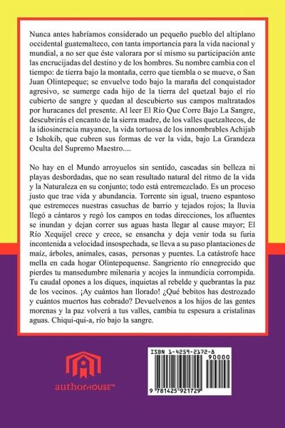 Nunca antes habríamos considerado un pequeño pueblo del altiplano occidental guatemalteco, con tanta importancia para la vida nacional y mundial, a no ser que éste valorara por sí mismo su participación ante las encrucijadas del destino y de los hombres. Su nombre cambia con el tiempo: de tierra bajo la montaña, cerro que tiembla o se mueve, o San Juan Olintepeque; se envuelve todo bajo la maraña del conquistador agresivo, se sumerge cada hijo de la tierra del quetzal bajo el río cubierto de sangre y quedan al descubierto sus campos maltratados por huracanes del presente. Al leer El Río Que Corre Bajo La Sangre, descubrirás el encanto de la sierra madre, de los valles quetzaltecos, de la idiosincracia mayance, la vida tortuosa de los innombrables Achijab e Ishokib, que cubren sus formas de ver la vida, bajo La Grandeza Oculta del Supremo Maestro.... No hay en el Mundo arroyuelos sin sentido, cascadas sin belleza ni playas desbordadas, que no sean resultado natural del ritmo de la vida y la Naturaleza en su conjunto; todo está entremezclado. Es un proceso justo que trae vida y abundancia. Torrente sin igual, trueno espantoso que estremeces nuestras casuchas de barrio y tejados rojos; la lluvia llegó a cántaros y regó los campos en todas direcciones, los afluentes se inundan y dejan correr sus aguas hasta llegar al cause mayor; El Río Xequijel crece y crece, se ensancha y deja venir toda su furia incontenida a velocidad insospechada, se lleva a su paso plantaciones de maíz, árboles, animales, casas, personas y puentes. La catástrofe hace mella en cada hogar Olintepequense. Sangriento río ennegrecido que pierdes tu mansedumbre milenaria y acojes la inmundicia corrompida. Tu caudal opones a los diques, inquietas al rebelde y quebrantas la paz de los vecinos. ¡Ay cuántos han llorado! ¿Qué bebitos has destrozado y cuántos muertos has cobrado? Devuelvenos a los hijos de las gentes morenas y la paz volverá a tus valles, cambia tu espesura a cristalinas aguas. Chiqui-qui-a, río bajo la sangre.