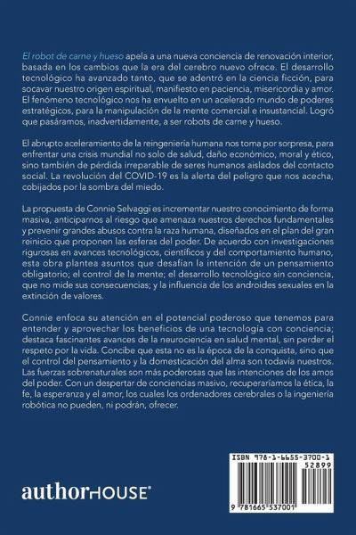 El robot de carne y hueso apela a una nueva conciencia de renovación interior, basada en los cambios que la era del cerebro nuevo ofrece. El desarrollo tecnológico ha avanzado tanto, que se adentró en la ciencia ficción, para socavar nuestro origen espiritual, manifiesto en paciencia, misericordia y amor. El fenómeno tecnológico nos ha envuelto en un acelerado mundo de poderes estratégicos, para la manipulación de la mente comercial e insustancial. Logró que pasáramos, inadvertidamente, a ser robots de carne y hueso. El abrupto aceleramiento de la reingeniería humana nos toma por sorpresa, para enfrentar una crisis mundial no solo de salud, daño económico, moral y ético, sino también de pérdida irreparable de seres humanos aislados del contacto social. La revolución del COVID-19 es la alerta del peligro que nos acecha, cobijados por la sombra del miedo. La propuesta de Connie Selvaggi es incrementar nuestro conocimiento de forma masiva, anticiparnos al riesgo que amenaza nuestros derechos fundamentales y prevenir grandes abusos contra la raza humana, diseñados en el plan del gran reinicio que proponen las esferas del poder. De acuerdo con investigaciones rigurosas en avances tecnológicos, científicos y del comportamiento humano, esta obra plantea asuntos que desafían la intención de un pensamiento obligatorio; el control de la mente; el desarrollo tecnológico sin conciencia, que no mide sus consecuencias; y la influencia de los androides sexuales en la extinción de valores. Connie enfoca su atención en el potencial poderoso que tenemos para entender y aprovechar los beneficios de una tecnología con conciencia; destaca fascinantes avances de la neurociencia en salud mental, sin perder el respeto por la vida. Concibe que esta no es la época de la conquista, sino que el control del pensamiento y la domesticación del alma son todavía nuestros. Las fuerzas sobrenaturales son más poderosas que las intenciones de los amos del poder. Con un despertar de conciencias masivo, recuperaríamos la ética, la fe, la esperanza y el amor, los cuales los ordenadores cerebrales o la ingeniería robótica no pueden, ni podrán, ofrecer.