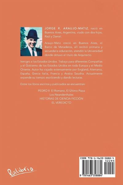 JORGE R. ARAUJO-MATIZ, nació en Buenos Aires, Argentina, viudo con dos hijos, Raúl y Daniel. Araujo-Matiz creció en Buenos Aires, el Barrio de Mataderos, allí recibió primaria y secundaria educación, atendió la Universidad donde obtuvo el titulo de Arquitecto. Inmigro a los Estados Unidos. Trabajo para diferentes Compañías y el Gobierno de los Estados Unidos en toda Europa y el Medio Oriente. Autor ha viajado extensamente por England, Alemania, España, Grecia Italia, Francia y Arabia Saudita. Actualmente expende su tiempo escribiendo y dando lecturas. Entre los libros escritos y publicados se encuentran: PEDRO II El Romano, El Último Papa Los Neanderthales HISTORIAS DE CIENCIA FICCIÓN EL VEREDICTO