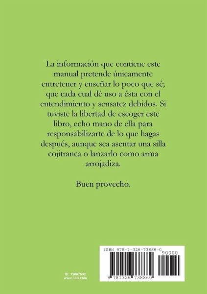 La información que contiene este manual pretende únicamente entretener y enseñar lo poco que sé; que cada cual dé uso a ésta con el entendimiento y sensatez debidos. Si tienes la libertad de escoger este libro, echo mano de ella para responsabilizarte de lo que hagas después, aunque sea asentar una silla cojitranca o lanzarlo como arma arrojadiza. Buen provecho.