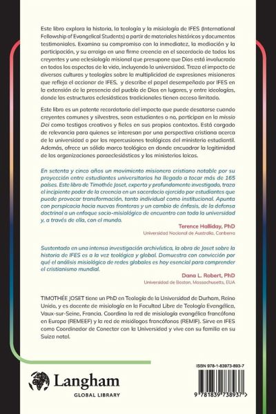 Este libro explora la historia, la teología y la misiología de IFES (International Fellowship of Evangelical Students) a partir de materiales históricos y documentos testimoniales. Examina su compromiso con la inmediatez, la mediación y la participación, y su arraigo en una firme creencia en el sacerdocio de todos los creyentes y una eclesiología misional que presupone que Dios está involucrado en todos los aspectos de la vida, incluyendo la universidad. Traza el impacto de diversas culturas y teologías sobre la multiplicidad de expresiones misioneras que refleja el accionar de IFES, y describe el papel desempeñado por IFES en la extensión de la presencia del pueblo de Dios en lugares, y entre ideologías, donde las estructuras eclesiásticas tradicionales tienen acceso limitado. Este libro es un potente recordatorio del impacto que puede desatarse cuando creyentes comunes y silvestres, sean estudiantes o no, participan en la missio Dei como testigos creativos y fieles en sus propios contextos. Está cargado de relevancia para quienes se interesan por una perspectiva cristiana acerca de la universidad o por las repercusiones teológicas del ministerio estudiantil. Además, ofrece un sólido marco teológico en donde encuadrar la legitimidad de las organizaciones paraeclesiásticas y los ministerios laicos.