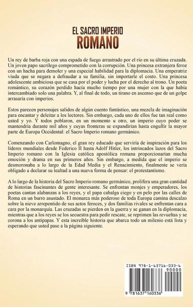 Si quiere descubrir la fascinante historia del Sacro Imperio romano, entonces, siga leyendo... Comenzando con Carlomagno, el gran rey educado que serviría de inspiración para los líderes mundiales desde Federico II hasta Adolf Hitler, los intrincados lazos del Sacro Imperio romano con la Iglesia católica apostólica romana proporcionarían mucha emoción y drama en sus primeros años. Sin embargo, a medida que el imperio se desmoronaba a lo largo de la Edad Media y el Renacimiento, finalmente se vería obligado a declarar su lealtad a una nueva forma de pensar: el protestantismo. A lo largo de la historia del Sacro Imperio romano, proliferan muchas historias fascinantes de gente interesante. Se enfrentan monjes y emperadores, los poetas cantan alabanzas de los reyes, y el papa cabalga por las calles de Roma ciego y en pelo en un burro asustado. El monarca más poderoso de todo el mundo camina descalzo en la nieve arrepentido de sus actos feroces, y dos familias rivales se enfrentan cara a cara por la monarquía. Las cruzadas se pierden en la guerra y se ganan en la diplomacia, mientras que a los reyes se les retiene para pedir rescate, se reprimen las revueltas y se corona a los antipapas. Y esta increíble historia que abarca todo un milenio está lista y esperando que usted pase a la página siguiente. In El Sacro Imperio Romano: Una Fascinante Guía para Entender la Unión de Reinos Más Pequeños que Comenzara Durante la Alta Edad Media y que se Disolviera Durante las Guerras Napoleónicas, descubrirá temas como:El Primer Imperio Romano Los Carolingios Un Emperador Formal El Calígula del Cristianismo Antipapa La Caminata a Canossa Comienza la Dinastía Hohenstaufen El Rey Guerrero Barba Roja El Captor de Corazón de León Stupor Mundi El Gran Interregno El Rey de la Paz El Ascenso de los Habsburgo La Reforma Ocho Millones de Muertos La Disolución ¡Y mucho, mucho más! ¡Obtenga este libro ahora para aprender más sobre el Sacro Imperio romano germánico!