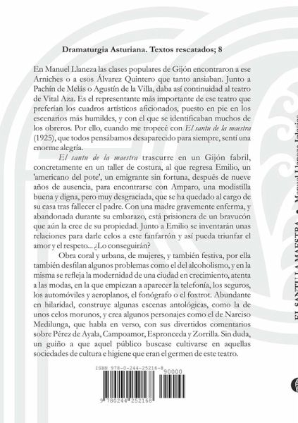 En Manuel Llaneza las clases populares encontraron a ese Arniches que tanto ansiaban, y seguía de cerca a Vital Aza. Es el representante más importante de un teatro de aficionados, puesto en pie en escenarios humildes. 'El santu de la maestra' (1925) trascurre en un taller de costura, al que regresa Emilio, un 'americano del pote', para encontrarse con Amparo, una modistilla muy desgraciada, abandonada por un bravucón que aún la cree de su propiedad. Junto a Emilio se inventarán unas relaciones para darle celos. Obra coral, urbana, de mujeres y festiva, por ella desfilan problemas como el del alcoholismo, y refleja la modernidad de una ciudad en crecimiento, atenta a modas y nuevos inventos. Abundante en hilaridad, construye escenas antológicas como la de unos celos morunos, y crea algunos personajes como el de Narciso, que habla en verso, con sus divertidos comentarios sobre Pérez de Ayala. Un guiño a aquel público que se cultivaba en aquellas sociedades de cultura e higiene, germen de este teatro.