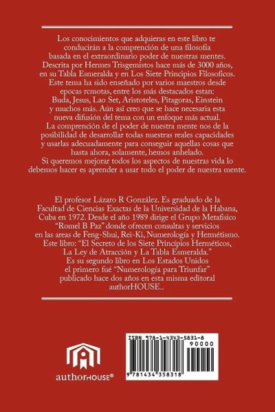 Los conocimientos que que adquieras en este libro teconduciran a la comprención de una filosofia basada en el extraordinario poder de nuestras mentes. Enseñados por Hermes Trismegistus hace más de 3000 años, en su Tabla Esmeralda y en sus Siete Principios Filosoficos. Este tema ha sido enseñado por varios maestros desde epocas remotas en la historia de la humanidad. Entre los más destacados y conocidos por mencionar solo algunos tenemos a Buda, Jesus, Lao Set, Aristoteles, Pitagoras y Einstein. Este libro es mi muy humilde contribución a la difusion de las ideas de estos grandes pensadores; a la cual he tratado de darle un enfoque más actual y más simple que los textos anteriores y por su puesto rompiendo con el secretismo que hasta ahora acompaño a estas filosofias. Lo más importante para todos los seres humanos es la comprensión de que: El poder de nuestras mentes nos da la posibilidad de desarrollar nuestras reales capacidades y a usarlas adecuadamente para conseguir aquellas cosas que hasta ahora hemos solamente deseado. Si queremos mejorar todos los aspectos de nuestra existencia lo que tenemos que hacer es: Aprender a usar el infinito poder de nuestra mente.