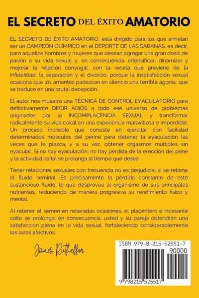 EL SECRETO DE ÉXITO AMATORIO, de JAMES RUTHEFFOR, está dirigido para los que anhelan ser un CAMPEÓN OLÍMPICO en el DEPORTE DE LAS SÁBANAS, es decir, para aquellos hombres y mujeres que desean agregar una gran dosis de pasión a su vida sexual y, en consecuencia, intensificar, dinamizar y mejorar la relación conyugal, con la receta que previene de la infidelidad, la separación y el divorcio, porque la insatisfacción sexual ocasiona que los amantes padezcan en silencio una terrible agonía, que se traduce en una brutal decepción. A consecuencia de la incomplacencia, llegan aquellos días en que la pareja se halla indispuesta y la inactividad sexual hace peligrar aún más la relación. Con las esperanzas perdidas y las expectativas asesinadas, la luna de miel se termina y en consecuencia surgen una serie de conflictos, como si la relación se hallase maldita. Quejas, rabietas, indiferencia y la sensación de que todo parece estar mal, son algunos síntomas de las expectativas no cumplidas. El autor nos muestra una TÉCNICA DE CONTROL EYACULATORIO para definitivamente DECIR ADIÓS a todo ese universo de problemas originados por la INCOMPLACENCIA SEXUAL y transformar radicalmente su vida coital en una experiencia maravillosa e imperdible. Un proceso increíble que consiste en ejercitar con facilidad determinados músculos del periné para detener la eyaculación las veces que le plazca, y a su vez, obtener orgasmos múltiples sin eyacular. Si no hay eyaculación, no hay pérdida de la erección del pene y la actividad coital se prolonga al tiempo que desea. Recuerda que después de haber prolongado varias veces su actividad coital, usted puede decidir en qué momento eyacular. Tener relaciones sexuales con frecuencia no es perjudicial si se retiene el fluido seminal. Es precisamente la pérdida constante de este sustancioso fluido, lo que desprovee al organismo de sus principales nutrientes, reduciendo de manera progresiva su rendimiento físico y mental. Al retener el semen en reiteradas ocasiones, el placentero e incesante coito se prolonga, en consecuencia, usted y su pareja obtendrán una satisfacción plena en la vida sexual, fortaleciendo considerablemente los lazos afectivos.