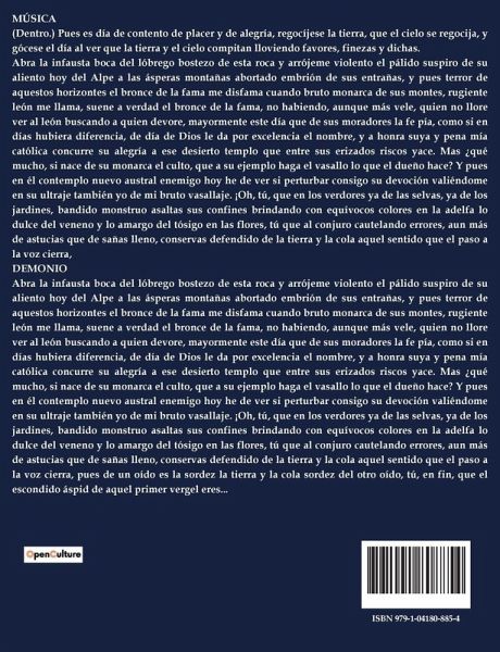 MÚSICA (Dentro.) Pues es día de contento de placer y de alegría, regocíjese la tierra, que el cielo se regocija, y gócese el día al ver que la tierra y el cielo compitan lloviendo favores, finezas y dichas. Abra la infausta boca del lóbrego bostezo de esta roca y arrójeme violento el pálido suspiro de su aliento hoy del Alpe a las ásperas montañas abortado embrión de sus entrañas, y pues terror de aquestos horizontes el bronce de la fama me disfama cuando bruto monarca de sus montes, rugiente león me llama, suene a verdad el bronce de la fama, no habiendo, aunque más vele, quien no llore ver al león buscando a quien devore, mayormente este día que de sus moradores la fe pía, como si en días hubiera diferencia, de día de Dios le da por excelencia el nombre, y a honra suya y pena mía católica concurre su alegría a ese desierto templo que entre sus erizados riscos yace. Mas ¿qué mucho, si nace de su monarca el culto, que a su ejemplo haga el vasallo lo que el dueño hace? Y pues en él contemplo nuevo austral enemigo hoy he de ver si perturbar consigo su devoción valiéndome en su ultraje también yo de mi bruto vasallaje. ¡Oh, tú, que en los verdores ya de las selvas, ya de los jardines, bandido monstruo asaltas sus confines brindando con equívocos colores en la adelfa lo dulce del veneno y lo amargo del tósigo en las flores, tú que al conjuro cautelando errores, aun más de astucias que de sañas lleno, conservas defendido de la tierra y la cola aquel sentido que el paso a la voz cierra, DEMONIO Abra la infausta boca del lóbrego bostezo de esta roca y arrójeme violento el pálido suspiro de su aliento hoy del Alpe a las ásperas montañas abortado embrión de sus entrañas, y pues terror de aquestos horizontes el bronce de la fama me disfama cuando bruto monarca de sus montes, rugiente león me llama, suene a verdad el bronce de la fama, no habiendo, aunque más vele, quien no llore ver al león buscando a quien devore, mayormente este día que de sus moradores la fe pía, como si en días hubiera diferencia, de día de Dios le da por excelencia el nombre, y a honra suya y pena mía católica concurre su alegría a ese desierto templo que entre sus erizados riscos yace. Mas ¿qué mucho, si nace de su monarca el culto, que a su ejemplo haga el vasallo lo que el dueño hace? Y pues en él contemplo nuevo austral enemigo hoy he de ver si perturbar consigo su devoción valiéndome en su ultraje también yo de mi bruto vasallaje. ¡Oh, tú, que en los verdores ya de las selvas, ya de los jardines, bandido monstruo asaltas sus confines brindando con equívocos colores en la adelfa lo dulce del veneno y lo amargo del tósigo en las flores, tú que al conjuro cautelando errores, aun más de astucias que de sañas lleno, conservas defendido de la tierra y la cola aquel sentido que el paso a la voz cierra, pues de un oído es la sordez la tierra y la cola sordez del otro oído, tú, en fin, que el escondido áspid de aquel primer vergel eres...