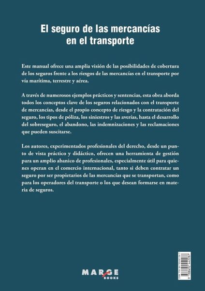 Este manual ofrece una amplia visión de las posibilidades de cobertura de los seguros frente a los riesgos de las mercancías en el transporte por vía marítima, terrestre y aérea. A través de numerosos ejemplos prácticos y sentencias, esta obra aborda todos los conceptos clave de los seguros relacionados con el transporte de mercancías, desde el propio concepto de riesgo y la contratación del seguro, los tipos de póliza, los siniestros y las averías, hasta el desarrollo del sobreseguro, el abandono, las indemnizaciones y las reclamaciones que pueden suscitarse. Los autores, experimentados profesionales del derecho, desde un punto de vista práctico y didáctico, ofrecen una herramienta de gestión para un amplio abanico de profesionales, especialmente útil para quienes operan en el comercio internacional, tanto si deben contratar un seguro por ser propietarios de las mercancías que se transportan, como para los operadores del transporte o los que desean formarse en materia de seguros.