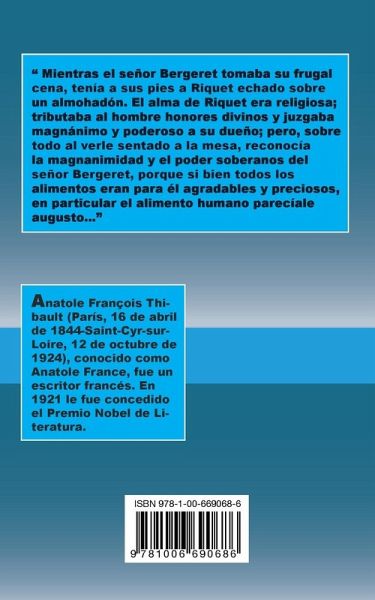 Mientras el señor Bergeret tomaba su frugal cena, tenía a sus pies a Riquet echado sobre un almohadón. El alma de Riquet era religiosa; tributaba al hombre honores divinos y juzgaba magnánimo y poderoso a su dueño; pero, sobre todo al verle sentado a la mesa, reconocía la magnanimidad y el poder soberanos del señor Bergeret, porque si bien todos los alimentos eran para él agradables y preciosos, en particular el alimento humano parecíale augusto.