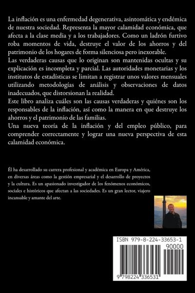 La inflación es una enfermedad degenerativa, asintomática y endémica de nuestra sociedad. Representa la mayor calamidad económica, que afecta a la clase media y a los trabajadores. Como un ladrón furtivo roba momentos de vida, destruye el valor de los ahorros y del patrimonio de los hogares de forma silenciosa pero inexorable. Las verdaderas causas que lo originan son mantenidas ocultas y su explicación es incompleta y parcial. Las autoridades monetarias y los institutos de estadísticas se limitan a registrar unos valores mensuales utilizando metodologías de análisis y observaciones de datos inadecuados, que distorsionan la realidad. Este libro analiza cuáles son las causas verdaderas y quiénes son los responsables de la inflación, así como la manera en que destruye los ahorros y el patrimonio de las familias. Una nueva teoría de la inflación y del empleo público, para comprender correctamente y lograr una nueva perspectiva de esta calamidad económica.