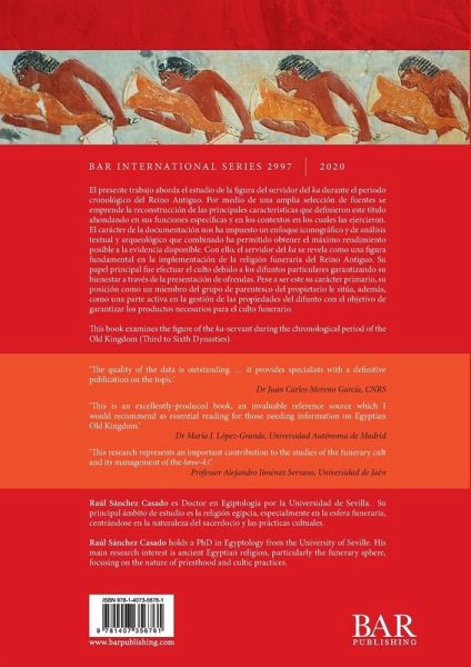 El presente trabajo aborda el estudio de la figura del servidor del ka durante el periodo cronológico del Reino Antiguo. Por medio de una amplia selección de fuentes se emprende la reconstrucción de las principales características que definieron este título ahondando en sus funciones específicas y en los contextos en los cuales las ejercieron. El carácter de la documentación nos ha impuesto un enfoque iconográfico y de análisis textual y arqueológico que combinado ha permitido obtener el máximo rendimiento posible a la evidencia disponible. Con ello, el servidor del ka se revela como una figura fundamental en la implementación de la religión funeraria del Reino Antiguo. Su papel principal fue efectuar el culto debido a los difuntos particulares garantizando su bienestar a través de la presentación de ofrendas. Pese a ser este su carácter primario, su posición como un miembro del grupo de parentesco del propietario le sitúa, además, como una parte activa en la gestión de las propiedades del difunto con el objetivo de garantizar los productos necesarios para el culto funerario. This book examines the figure of the ka-servant during the chronological period of the Old Kingdom (Third to Sixth Dynasties).