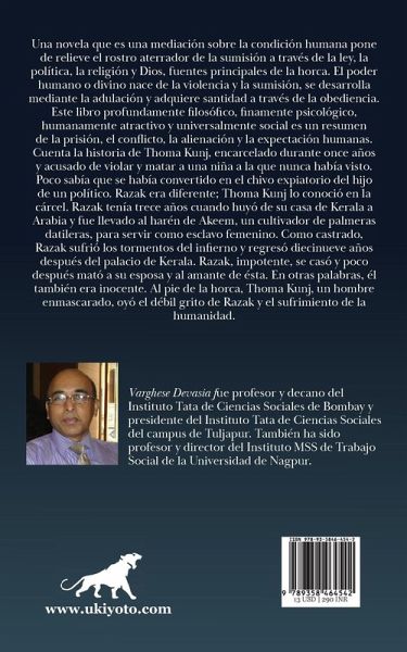 Una novela que es una mediación sobre la condición humana pone de relieve el rostro aterrador de la sumisión a través de la ley, la política, la religión y Dios, fuentes principales de la horca. El poder humano o divino nace de la violencia y la sumisión, se desarrolla mediante la adulación y adquiere santidad a través de la obediencia. Este libro profundamente filosófico, finamente psicológico, humanamente atractivo y universalmente social es un resumen de la prisión, el conflicto, la alienación y la expectación humanas. Cuenta la historia de Thoma Kunj, encarcelado durante once años y acusado de violar y matar a una niña a la que nunca había visto. Poco sabía que se había convertido en el chivo expiatorio del hijo de un político. Razak era diferente; Thoma Kunj lo conoció en la cárcel. Razak tenía trece años cuando huyó de su casa de Kerala a Arabia y fue llevado al harén de Akeem, un cultivador de palmeras datileras, para servir como esclavo femenino. Como castrado, Razak sufrió los tormentos del infierno y regresó diecinueve años después del palacio de Kerala. Razak, impotente, se casó y poco después mató a su esposa y al amante de ésta. En otras palabras, él también era inocente. Al pie de la horca, Thoma Kunj, un hombre enmascarado, oyó el débil grito de Razak y el sufrimiento de la humanidad.
