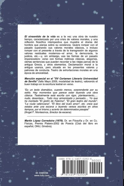Una obra de teatro en verso de nuestro tiempo, caracterizado por una crisis de valores morales, y una reflexión filosófica intempestiva que muestra el drama del hombre que piensa sobre su existencia. Quiere romper con el pasado superando sus valores morales clásicos, o incluso romper con el presente a través de la transgresión de algunos valores residuales modernos-el amor, la democracia, la justicia, etc.-y, sin embargo, usa las formas de un pasado imperecedero. Mención especial en el XV Certamen Literario Universidad de Sevilla. "Es un texto dramático, cuando menos, sorprendente por su estilo. Hay momentos que parece estar leyendo una obra clásica. (...) creía que estaba ante una escena o leyendo versos escritos en otros tiempos, por el lirismo y acierto de determinados pasajes." (Ángel F. Montesinos, director de escena). Martín López Corredoira (1970), Dr. en Filosofía y Dr. en Cc. Físicas, Premio Platero-2002 de Poesía (Club del libro en español, ONU, Ginebra)