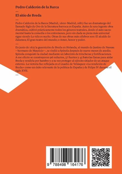En El sitio de Breda Pedro Calderón de la Barca relata un suceso histórico: En junio de 1625 la guarnición de Breda en Holanda, al mando de Justino de Nassau -hermano de Mauricio-, se rindió a Spínola después de nueve meses de asedio. Spínola conquistó la ciudad mediante un laberinto de trincheras y fortificaciones. A ese efecto se construyeron 96 reductos, 37 fuertes y 45 baterías llanas para aislar Breda y rendirla por hambre y a su vez proteger al ejército sitiador de un ataque externo. La victoria de El sitio de Breda también fue reflejada en el cuadro de Velásquez La rendición de Breda…mehr