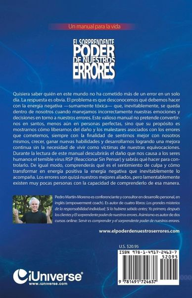 Quisiera saber quién en este mundo no ha cometido más de un error en un solo día. La respuesta es obvia. El problema es que desconocemos qué debemos hacer con la energía negativa -sumamente tóxica- que, inevitablemente, se queda dentro de nosotros cuando manejamos incorrectamente nuestras emociones y decisiones en torno a nuestros errores. Este valioso manual no pretende convertirnos en santos, menos aún en personas perfectas, sino que su propósito es mostrarnos cómo liberarnos del daño y los malestares asociados con los errores que cometemos, siempre con la finalidad de sentirnos mejor con nosotros mismos, crecer, ganar nuevas habilidades y desarrollarnos logrando una mejora continua sin la necesidad de vivir como víctimas de nuestras equivocaciones. Durante la lectura de este manual descubrirás el daño que nos causa a los seres humanos el temible virus RSP (Reaccionar Sin Pensar) y sabrás qué hacer para controlarlo. De igual modo, comprenderás qué es el sentimiento de culpa y cómo transformar en energía positiva la energía negativa que inevitablemente lo acompaña. Los errores son quizá nuestros mejores aliados, pero lamentablemente existen muy pocas personas con la capacidad de comprenderlo de esa manera.