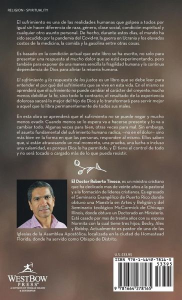 El sufrimiento es una de las realidades humanas que golpea a todos por igual sin hacer diferencia de raza, género, clase social, condición espiritual y cualquier otro asunto personal. De hecho, durante estos días, el mundo ha sido sacudido por la pandemia del Covid-19, la guerra en Ucrania y los elevados costos de la medicina, la comida y la gasolina entre otras cosas. Es basado en la condición actual que este libro se ha escrito, no solo para presentar una respuesta al mucho dolor que se está experimentando, pero también para exponer de una manera sencilla la fragilidad humana y la continua dependencia de Dios para aliviar la miseria humana. El sufrimiento y la respuesta de los justos es un libro que se debe leer para entender el por qué del sufrimiento que se vive en esta vida. En el mismo se aprenderá que el sufrimiento no puede cambiar el carácter del creyente, mucho menos debilitar la fe, sino todo lo contrario, el resultado de la experiencia dolorosa sacará lo mejor del hijo de Dios y lo transformará para servir mejor a aquel que lo libra permanentemente de todos sus males. En esta obra se aprenderá que el sufrimiento no se puede negar y mucho menos evadir. Cuando menos se lo espera va a hacerse presente y lo va a cambiar todo. Algunas veces para bien, otras veces para mal. Sin embargo, el asunto fundamental del sufrimiento humano radica, -no en el dolor- sino más bien en la forma en que las personas, responden al mismo. Ellos saben que, si están atravesando un mal momento, una prueba, una lucha o incluso una calamidad, es porque Dios lo ha permitido, y Él tiene el control de todo y no será tocado o cargado más de lo que pueda resistir.