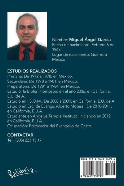 Nombre: Miguel Ángel García. Fecha de nacimiento: Febrero 6 de 1963. Lugar de nacimiento: Guerrero México ESTUDIOS REALIZADOS Primaria: De 1972 a 1978, en México. Secundaria: De 1978 a 1981, en México. Preparatoria: De 1981 a 1984, en México. Estudió la Biblia Thompson: en el año 2006, en California, E.U. de A. Estudió en I.S.O.M.: De 2008 a 2009, en California, E.U. de A. Estudió en Esc. de Evangs. Alberto Motessi: De 2010-2011, en California, E.U.A. Estudiante en Ángelus Temple Instituto: Iniciando en 2012, en California, E.U.A. Ocupación: Predicador del Evangelio de Cristo. CONTACTAR Correo electro.: garciamig@earthlink.net Tel.: (805) 223 15 17