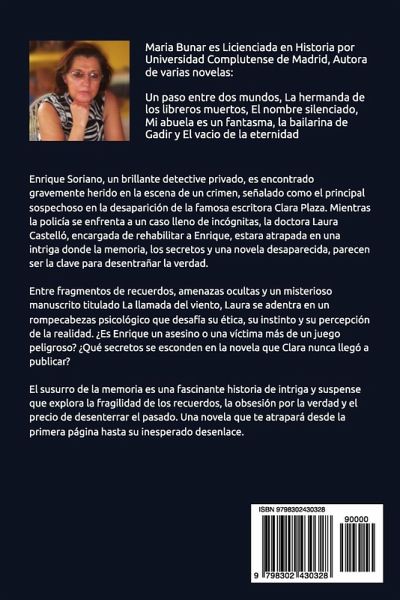 "El susurro de la memoria" es una novela de misterio y drama psicológico que comienza con una introducción llena de simbolismo, donde una mujer se enfrenta a una fuerza interna poderosa, simbolizada por el viento. A partir de ahí, la trama sigue a la doctora Laura Castelló, quien asume el complejo caso de Enrique Soriano, un paciente con amnesia y serias lesiones cerebrales, acusado de ser el principal sospechoso en el asesinato de la escritora Clara Plaza. Sin embargo, el cuerpo de Clara nunca ha sido encontrado. A medida que Laura investiga el pasado de Enrique, descubre un entramado de relaciones tensas, secretos ocultos y vínculos ambiguos entre los personajes principales. La escritora Clara, que fue famosa por sus novelas pero cayó en el desprestigio, había contratado a Enrique como detective privado tras recibir amenazas relacionadas con una novela inédita, "La llamada del viento". Esta obra parece estar en el centro de todo, pues su desaparición junto con Clara añade un nuevo nivel de misterio. El libro combina elementos de investigación policial, conflictos emocionales y dilemas éticos. Enrique es presentado como un personaje lleno de ambigüedad, incapaz de defenderse debido a su estado de salud, mientras Laura lucha con su propio interés creciente por el caso y su sentido profesional. Por su parte, Ana Solís, la secretaria de Enrique, muestra comportamientos contradictorios, marcados por la tensión emocional hacia su jefe y el desprecio hacia Clara Plaza. El descubrimiento de una frase en una librería que coincide con el título de la novela perdida de Clara añade un nuevo giro al misterio. Mientras tanto, se entrelazan historias del pasado que sugieren traiciones, tensiones y secretos dentro del círculo literario de Clara, además de una posible conexión con una editorial extinta y un autor olvidado. El relato desarrolla una atmósfera envolvente y llena de detalles que mantienen al lector en suspense mientras las piezas del rompecabezas se colocan poco a poco en su lugar. La narrativa mezcla la investigación de los hechos con la exploración psicológica de sus personajes, ofreciendo un análisis profundo de la memoria, la culpa y las relaciones humanas.