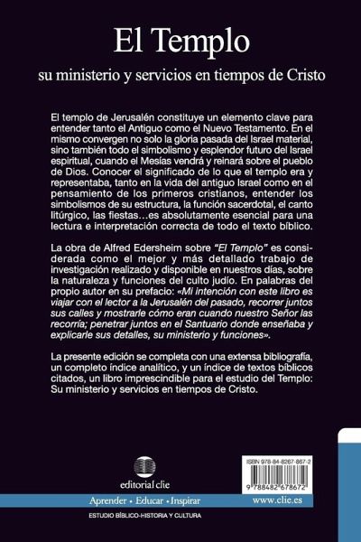 El Templo, escrito por Alfred Edersheim, es un detallado trabajo de investigaci¿¿n que estudia El Templo de Jerusal¿¿n, un elemento clave para entender tanto el Antiguo Testamento como el Nuevo Testamento. El autor nos transporta diecinueve siglos en el pasado; para mostrarnos Jerusal¿¿n como era entonces, cuando nuestro Se¿¿or pasaba por sus calles y por el santuario, cuando ense¿¿aba por sus porches y atrios. Describe no solo la apariencia y la estructura del Templo, sino tambi¿¿n sus ordenanzas y adoradores, el ministerio de su sacerdocio y el ritual de sus servicios. El autor tambi¿¿n busca mostrarnos la vida religiosa del periodo en el que Jes¿¿s vivi¿¿ sobre la tierra, las circunstancias bajo las que ense¿¿¿¿, y los ritos religiosos de los que estaba rodeado, y cuyo significado, en su m¿¿s verdadero sentido, vino ¿¿l a cumplir. Jehov¿¿, el Dios de Israel, es tambi¿¿n el Dios y Padre de Nuestro Se¿¿or y Salvador Jesucristo. En este libro encontrar¿¿s: Ministerio y funciones del Templo en tiempos de Cristo. La relaci¿¿n del Templo con la vida y obra de Cristo. Naturaleza y funciones del culto jud¿¿o. Simbolismos del Templo. The Temple, Its Ministry and Service The Temple by Alfred Edersheim, it is a detailed research work that studies The Temple of Jerusalem, a key element in understanding both the Old and New Testament. The author takes us nineteen centuries in the past; to show us how Jerusalem was then, when our Lord passed through its streets, and through the sanctuary, when he taught through its porches and courts. It describes not only the appearance and structure of the Temple, but also their ordinances and worshipers, the ministry of priesthood, and their rituals. The author also seeks to show us the religious life of the period in which Jesus lived on earth, the circumstances under which he taught, and the religious rites with which he was surrounded, and whose meaning, in its truest sense, he came to fulfill. Jehovah, the God of Israel, is also the God and Father of our Lord and Savior Jesus Christ. In this book you will find: Ministry and functions of the Temple in the times of Christ. The way Jesus and his work is related to the Temple. Nature and functions of Judaism. The Temple's symbolism.