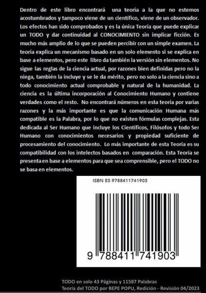 ¿De qué trata la teoría? Presentación de un posible mecanismo sobre el funcionamiento del TODO que se explica a base de elementos cuando se trata del Universo y una explicación sin Elementos cuando se trata del TODO. El TODO no está basado en ELEMENTOS por lo que no es totalmente compatible con la FÍSICA Científica o la percepción compatible Humana, debido a nuestra composición tangible. Para entender la Teoría habrá que entender los efectos que se generan en una ABSORCIÓN en general y la Teoría está sustentada en un EXPERIMENTO sencillo y compatible que aparece en uno de los libros , hay vídeos en YouTube. En los Libros se utilizan palabras que se insiste en ser compatibles y que son las que mejor describen los efectos a los que se hace referencia. Ejemplos de palabras compatibles UTILIZADAS son: Masa, Masas, Espacio, Absorción, Desplazamiento, Movimiento, Inteligencia, Humano, Humanidad, Todo, Expansión, Condición Intermedia, Energía, Tangible, Intangible Y Quizás Alguno Más. La razón es que esta teoría no inventa nada y tampoco palabras, se explica con lo que ya está disponible. Esta Teoría contiene el orden de aparición de los efectos importantes en el desarrollo del Todo y da las causas. Parte de un solo elemento que explica el Orden de Aparición de: Espacio, Trayectorias, La Omnidireccional, La Intermedia, Aproximación sin Desplazamiento, Depresión, Desplazamiento Orbital, Deslizamiento Orbital, Energía, Formación de Átomos, Formación de Materia, Propiedad de Reacción, Trayectorias Lineales , Aglomeraciones Masivas De Masas, Agujeros Negros, Disminución De Espacio, Vida, Conocimiento, Humano, Humanidad y sucesivas previsiones hasta que TODO pase del CICLO. Explica un TODO CÍCLICO y da la razón donde la HUMANIDAD tendrá que buscar la solución para continuar entre CICLOS. Esta Teoría no es científica, es mucho más y si se considera Científica le restará mérito, es una Teoría que da una versión basada en el Conocimiento actual natural de la Humanidad que explica un mecanismo de que un TODO Tangible parte de algo Intangible de lo cual una incompatibilidad Científica, pero tiene una total compatibilidad con el Conocimiento Humano actual. No se insiste en que sea una Teoría Científica sino una Teoría que parte de un Humano como Observador que presenta una Teoría del TODO a los Humanos más Privilegiados de la Humanidad. Es una Teoría Completa donde hay más de lo que está escrito, abre el futuro de la comprensión, da una trayectoria de procesamiento.