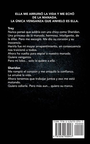 Ella me arruinó la vida y me echó de la manada. La única venganza que anhelo es ella. Trey Nunca pensé que saldría con una chica como Sheridan. Una princesa de la manada, hermosa, inteligente, de la élite. Pero me escogió. Me dio su corazón y su inocencia. Herirla fue mi mayor arrepentimiento, en consecuencia nos traicionó a todos. Ahora ha vuelto para espiar a nuestra manada. Quiere venganza. Pero mi lobo... solo la quiere a ella. Sheridan Me rompió el corazón y me aniquiló la confianza. Le arruiné la vida. Ahora tenemos que trabajar juntos y eso me está matando. Quiero odiarle. Pero más aun... quiero su marca.