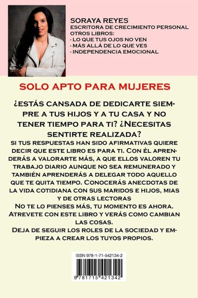 ¿Estás cansada de dedicarte siempre a tus hijos y a tu casa y no tener tiempo para ti? ¿Necesitas sentirte realizada? Si tus respuestas han sido afirmativas quiere decir que este libro es para ti. Con él aprenderás a valorarte más, a que ellos valoren tu trabajo diario aunque no sea remunerado y también aprenderás a delegar todo aquello que te quita tiempo. Conocerás anécdotas de la vida cotidiana de otras mujeres, mías y de otras lectoras sobre sus maridos e hijos. No te lo pienses más, tu momento es ahora. Atrévete con este libro y verás como cambian las cosas. Deja de seguir los roles de la sociedad y empieza a crear los tuyos propios.