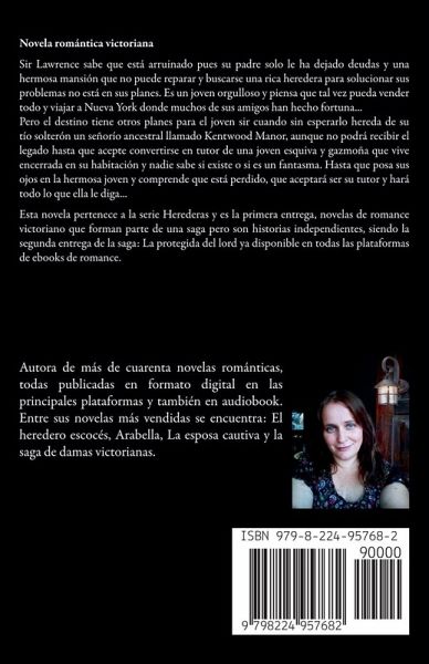 Novela romántica victoriana Sir Lawrence sabe que está arruinado pues su padre solo le ha dejado deudas y una hermosa mansión que no puede reparar y buscarse una rica heredera para solucionar sus problemas no está en sus planes. Es un joven orgulloso y piensa que tal vez pueda vender todo y viajar a Nueva York donde muchos de sus amigos han hecho fortuna... Pero el destino tiene otros planes para el joven sir cuando sin esperarlo hereda de su tío solterón un señorío ancestral llamado Kentwood Manor, aunque no podrá recibir el legado hasta que acepte convertirse en tutor de una joven esquiva y gazmoña que vive encerrada en su habitación y nadie sabe si existe o si es un fantasma. Hasta que posa sus ojos en la hermosa joven y comprende que está perdido, que aceptará ser su tutor y hará todo lo que ella le diga... Esta novela pertenece a la serie Herederas y es la primera entrega, novelas de romance victoriano que forman parte de una saga pero son historias independientes, siendo la segunda entrega de la saga: La protegida del lord ya disponible en todas las plataformas de ebooks de romance.
