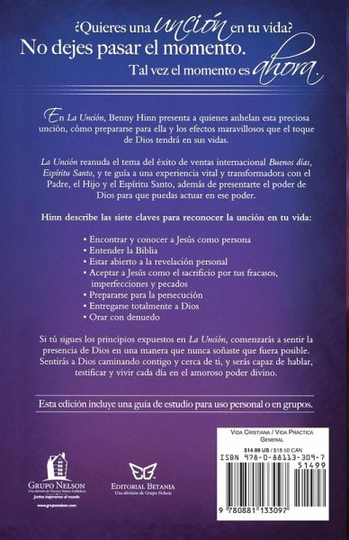 Benny Hinn muestra a aquellos hambrientos de esta preciosa unci¿¿n c¿¿mo prepararse para ello y los efectos maravillosos que tendr¿¿n por el toque de Dios. La Unci¿¿n retoma el tema del libro de mayor venta Buenos D¿¿as, Esp¿¿ritu Santo, y le gü¿a a una experiencia vital con el Padre, el Hijo y el Esp¿¿ritu Santo a la vez de presentarle el poder de Dios para que con el mismo poder usted pueda actuar. Los lectores comenzar¿¿n a sentir la presencia de Dios como resultado de seguir los principios del libro. Ellos podr¿¿n sentir a Dios caminando con y cerca de ellos y podr¿¿n ser capaces de hablar, testificar y vivir cada d¿¿a en el poder amoroso de Dios.