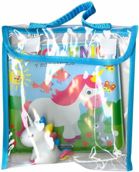 Un libro de plástico acolchado con ilustraciones a todo color de un simpático unicornio y sus amigos, y un muñeco de goma pensado para que los más pequeños de la casa disfruten siempre de la hora del baño.