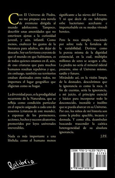EL UNIVERSO DE PIEDRA (Resumen de la Contracubierta Por Julián Portal Font) No. de Identificación para Palibrlio: 575663 Con El Universo de Piedra, no me propuse una novela de aventuras dirigida al mundo adolescente. Tampoco, describir unas amenidades que no estuviesen ajenas a la curiosidad juvenil, y aún, infantil. Como menos, enaltecer los gustos de la literatura para adultos, sin dejar de desearlo. Soy un ferviente creyente de que el mundo en que habitamos, es de todos quienes estamos en él, aún, de esas criaturas que para muchos humanos resultan repulsivas y que, sin embargo, también sus territorios estaban destinados entre todos, no importara el lugar geográfico que eligieran como su hogar. La diversidad pues, es la prodigalidad recurrente de la Naturaleza, que se refleja como condición particular en el espacio asignado a cada uno de nosotros (criaturas de este mundo), a expensas de los pormenores, acciones, hechos y sucesos aleatorios, promovidos por leyes universales irreversibles. Nada es más importante a una libélula; como el humano menos significante a las nieves del Everest. Y ni que decir de ese inhóspito orbe bacteriano: acechante e imperturbable en su modus vivendi heroico. Pero la roca simple, trasciende por sobre toda la fortaleza de la variabilidad. Deviene como la pureza misma de la dignidad existencial, en la cual, múltiples millones de seres se acogen a ella. La piedra no sería el mineral sideral presente, sino el Universo mismo, tardío y futuro. Mirándolo así, en la visión limpia de la desnudez, descubrimos que la ignorancia es como la roca. A fin de cuentas, sería la ignorancia, a mi juicio, el principio esencial y básico para incorporar todo lo desconocido, inestable e insólito que se pueda abarcar en su Universo. Por eso, los niños de mi historia son como la piedra: apacible, incauta y desnuda. Y como ella, deambulan buscando trascender la caótica heterogeneidad de su absoluta ignorancia. J.P.F.