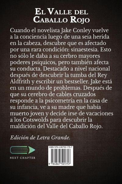 Cuando el novelista Jake Conley vuelve a la conciencia luego de una seia herida en la cabeza, descubre que es afectado por una rara condición: sinaestesia. Esto no sólo le daba a su cerbro mayores poderes psíquicos, pero también afecta su conducta. Destacado a nivel nacional después de descubrir la tumba del Rey Aldfrith y escribir un bestseller. Jake está en un mundo de problemas. Después de que su cerebro de cables cruzados responde a la psicometría en la casa de su infancia, ve a su madre que había muerto joven y decide irse de vacaciones a los Cotswolds para descubrir la maldición del Valle del Caballo Rojo. Edición de Letra Grande