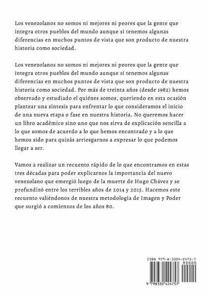 Los venezolanos no somos ni mejores ni peores que la gente que integra otros pueblos del mundo aunque sí tenemos algunas diferencias en muchos puntos de vista que son producto de nuestra historia como sociedad. Los venezolanos no somos ni mejores ni peores que la gente que integra otros pueblos del mundo aunque sí tenemos algunas diferencias en muchos puntos de vista que son producto de nuestra historia como sociedad. Por más de treinta años (desde 1982) hemos observado y estudiado el quiénes somos, queriendo en esta ocasión plantear una síntesis para enfrentar lo que consideramos el inicio de una nueva etapa o fase en nuestra historia. No queremos hacer un libro académico sino uno que nos sirva de explicación sencilla a lo que somos de acuerdo a lo que hemos encontrado y a lo que hemos sido para quizás arriesgarnos a expresar lo que podemos llegar a ser. Vamos a realizar un recuento rápido de lo que encontramos en estas tres décadas para poder explicarnos la importancia del nuevo venezolano que emergió luego de la muerte de Hugo Chávez y se profundizó entre los terribles años de 2014 y 2015. Hacemos este recuento valiéndonos de nuestra metodología de Imagen y Poder que surgió a comienzos de los años 80.