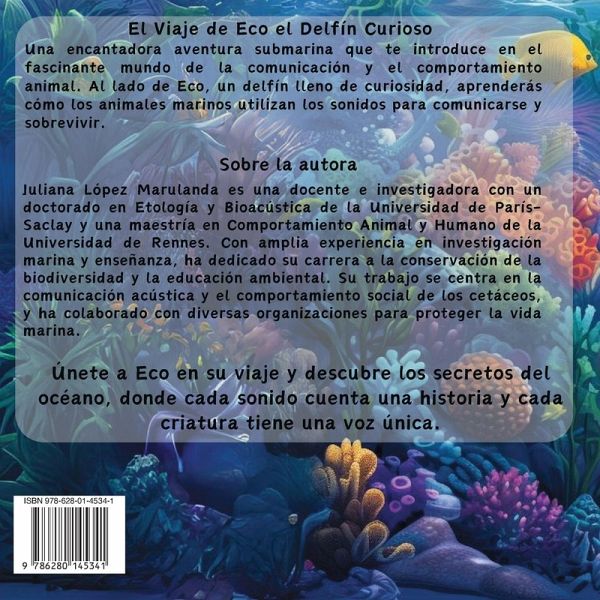 Título del Libro: El Viaje de Eco, el Delfín Curioso Descripción: Acompaña a Eco, un joven delfín curioso, en una mágica aventura submarina donde descubrirás cómo los animales marinos utilizan los sonidos para comunicarse y sobrevivir. Escrito por la Dra. Juliana López Marulanda, experta en etología y bioacústica, El Viaje de Eco combina ciencia y diversión, con ilustraciones atractivas y sonidos marinos reales grabados por la autora, accesibles mediante códigos QR.Capítulos Destacados:Un Día en el Océano: Eco aprende sobre los sonidos del océano con su madre. Encuentro con la Abuela: La abuela de Eco le revela los secretos de los sonidos marinos. Los Delfines y Sus Silbidos Firma: Eco descubre los silbidos únicos de cada delfín. Las Ballenas Cantoras: Eco escucha las canciones de las ballenas jorobadas. El Cachalote y la Ecolocación: Eco aprende sobre la ecolocación y cómo navegar en el océano. Características:Ilustraciones interactivas: Disfruta de imágenes coloridas que acompañan la historia. Códigos QR con sonidos reales del océano: Escucha los sonidos marinos grabados por la autora. Temas educativos: Introduce a los niños en la bioacústica y la conservación marina. Edad: A partir de 4 años