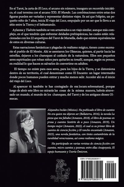 En el Tarot, la carta de El Loco, el arcano sin número, inaugura un recorrido iniciático, el cual termina con el arcano XXI: El mundo. Las combinaciones entre estas dos figuras pueden ser variadas y representar distintos viajes. Es así que Felipito, un pequeño niño de 7 años, inicia El viaje del Loco, empujado por un ser que lo lleva a un sitio entre la Tierra y el Inframundo. Aylanna y Tlaltzin también se ven arrastrados a un viaje similar, aunque más complejo, en el que tendrán que enfrentar deidades prehispánicas, las cuales están relacionadas con los 22 arquetipos del Tarot de Marsella, dado que existen equivalencias de estos en diversas culturas. Estas narraciones fantásticas y plagadas de realismo mágico, tienen como escenario el pueblo de El Mesón. Ahí se asentaron los Olmecas, quienes, al partir hacia las estrellas, dejaron a los chaneques al cuidado de la naturaleza. Ellos son pequeños seres espirituales que roban niños para quitarles su tonalli, aunque, según su pensar, en realidad lo que hacen es salvarlos de convertirse en adultos. El tiempo no existe para esos seres, para los hijos de la Tierra, y se distorsiona dentro de su territorio, el cual denominan como El Encanto: un lugar intermedio donde pocos humanos pueden entrar y mucho menos salir. Acceder ahí es el inicio del viaje del Loco. Al aparecer tú también te has contagiado de esa locura sobrenatural, porque luego de abrir este libro no mirarás las cosas de la misma manera, habrás atravesado un mundo, el mundo de los chaneques, del Tarot y de los antiguos dioses Olmecas.
