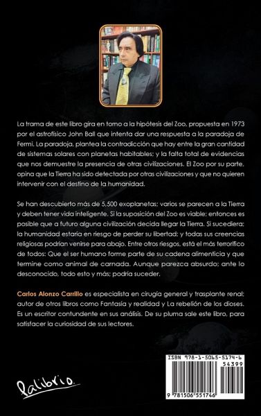La trama de este libro gira en torno a la hipótesis del Zoo, propuesta en 1973 por el astrofísico John Ball que intenta dar una respuesta a la paradoja de Fermi. La paradoja, plantea la contradicción que hay entre la gran cantidad de sistemas solares con planetas habitables; y la falta total de evidencias que nos demuestre la presencia de otras civilizaciones. El Zoo por su parte, opina que la Tierra ha sido detectada por otras civilizaciones y que no quieren intervenir con el destino de la humanidad. Se han descubierto más de 5,500 exoplanetas; varios se parecen a la Tierra y deben tener vida inteligente. Si la suposición del Zoo es viable; entonces es posible que a futuro alguna civilización decida llegar la Tierra. Si sucediera; la humanidad estaría en riesgo de perder su libertad; y todas sus creencias religiosas podrían venirse para abajo. Entre otros riesgos, está el más terrorífico de todos: Que el ser humano forme parte de su cadena alimenticia y que termine como animal de carnada. Aunque parezca absurdo; ante lo desconocido, todo esto y más; podría suceder. Carlos Alonzo Carrillo es especialista en cirugía general y trasplante renal; autor de otros libros como Fantasía y realidad y La rebelión de los dioses. Es un escritor contundente en sus análisis. De su pluma sale este libro, para satisfacer la curiosidad de sus lectores.