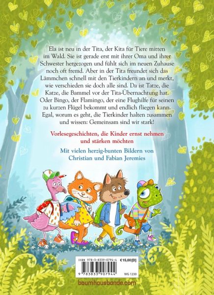 Hier kommt ELA! Mit viel Herz erzählt von "Dein SPIEGEL-Bestseller-Autorin" Annette LangenEla ist neu in der Tita, der Kita für Tiere mitten im Wald. Sie ist gerade erst mit ihrer Oma und ihrer Schwester hergezogen und fühlt sich im neuen Zuhause noch oft fremd. Aber in der Tita freundet sich das Lämmchen schnell mit den Tierkindern an und merkt, wie verschieden sie doch alle sind. Da ist Tatze, die Katze, die Bammel vor der Tita-Übernachtung hat. Oder Bingo, der Flamingo, der eine Flughilfe für seinen zu kurzen Flügel bekommt und endlich fliegen kann. Egal, worum es geht, die Tierkinder halten zusammen und wissen: Gemeinsam sind wir stark!Ein besonderes Buch mit vielen Extras:- Fröhliche Vorlesegeschichten von der Autorin von "Briefe von Felix"- Viele herzig-bunte Bilder von Christian und Fabian Jeremies- Die Kapitel haben eine ideale Vorlese-Länge (ca. 6-8 Minuten), z. B. vor dem Einschlafen oder einfach mal zwischendurch- Pädagogisch wertvoll: vermittelt wichtige Werte, stärktdas Selbstvertrauen der Kinder und spricht Themen wie Toleranz, Integration, Umzug, Freundschaft und Zusammenhalt an- Mit Lesebändchen und einem Rezept für Elas Gänseblümchenkuchen- Erste Leseförderung: Nach jedem gelesenen Kapitel kann vorn im Buch ein Luftballon ausgemalt werden, um den gemeinsamen Lesefortschritt sichtbar zu machen- Auch für die Schule geeignet: ein Quiz bei Antolin als Extra-Motivation für Selbstleser:innen!- Ein wunderschönes Geschenk für Kinder ab 4 Jahren
