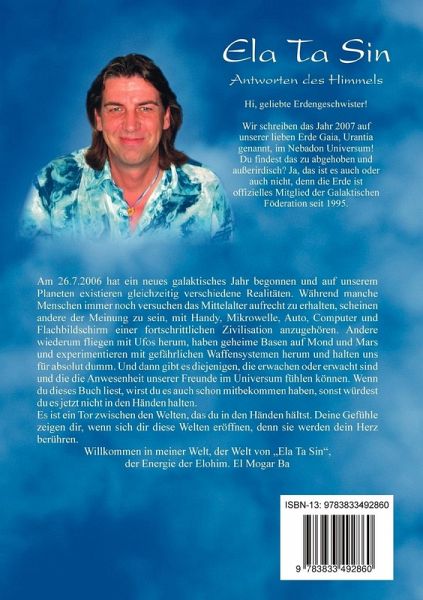 "Ela Ta Sin - Antworten des Himmels" ist die Fortsetzung des Buches "Ela Ta Sin - Die Energie der Elohim".Hi, geliebte Erdengeschwister!Wir schreiben das Jahr 2007 auf unserer lieben Erde Gaia, Urantia genannt, im Nebadon Universum!Du findest das zu abgehoben und außerirdisch? Ja, das ist es auch oder auch nicht, denn die Erde ist offizielles Mitglied der Galaktischen Föderation seit 1995.Am 26.7.2006 hat ein neues galaktisches Jahr begonnen und auf unserem Planeten existieren gleichzeitig verschiedene Realitäten. Während manche Menschen immer noch versuchen das Mittelalter aufrecht zu erhalten, scheinen andere der Meinung zu sein, mit Handy, Mikrowelle, Auto, Computer und Flachbildschirm einer fortschrittlichen Zivilisation anzugehören. Andere wiederum fliegen mit Ufos herum, haben geheime Basen auf Mond und Mars und experimentieren mit gefährlichen Waffensystemen herum und halten uns für absolut dumm. Und dann gibt es diejenigen, die erwachen oder erwacht sind und die die Anwesenheit unserer Freunde im Universum fühlen können. Wenn du dieses Buch liest, wirst du es auch schon mitbekommen haben, sonst würdest du es jetzt nicht in den Händen halten.Es ist ein Tor zwischen den Welten, das du in den Händen hältst. Deine Gefühle zeigen dir, wenn sich dir diese Welten eröffnen, denn sie werden dein Herz berühren.Willkommen in meiner Welt, der Welt von "Ela Ta Sin",der Energie der Elohim. El Mogar Ba
