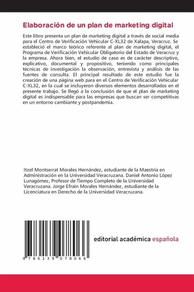 Este libro presenta un plan de marketing digital a través de social media para el Centro de Verificación Vehicular C-XL32 de Xalapa, Veracruz. Se estableció el marco teórico referente al plan de marketing digital, el Programa de Verificación Vehicular Obligatorio del Estado de Veracruz y la empresa. Ahora bien, el estudio de caso es de carácter descriptivo, explicativo, documental y propositivo, teniendo como principales técnicas de investigación la observación, entrevista y análisis de las fuentes de consulta. El principal resultado de este estudio fue la creación de una página web para en el Centro de Verificación Vehicular C-XL32, en la cual se incluyeron diversos elementos desarrollados en el presente trabajo. Se llegó a la conclusión de que el plan de marketing digital es indispensable para las empresas que buscan ser competitivas en un entorno cambiante y postpandemia.