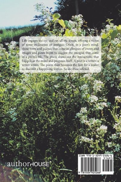 Life engages the eye and ear, all the senses, offering a vision of some inclination or intrigue. Often, in a poet's mind, those hints and guesses that come in glimpses of events and images and poses begin to suggest the energies that come in a poem's life. The poem draws out the interactions that happen in the mind and proposes itself. A poet is a writer; a writer writes. The poem then becomes the lure for a reader to discover a happening within. So are these offered.