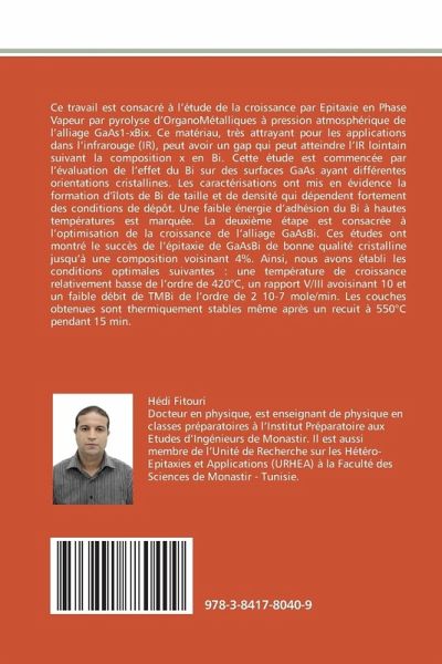 Ce travail est consacré à l'étude de la croissance par Epitaxie en Phase Vapeur par pyrolyse d'OrganoMétalliques à pression atmosphérique de l'alliage GaAs1-xBix. Ce matériau, très attrayant pour les applications dans l'infrarouge (IR), peut avoir un gap qui peut atteindre l'IR lointain suivant la composition x en Bi. Cette étude est commencée par l'évaluation de l'effet du Bi sur des surfaces GaAs ayant différentes orientations cristallines. Les caractérisations ont mis en évidence la formation d'îlots de Bi de taille et de densité qui dépendent fortement des conditions de dépôt. Une faible énergie d'adhésion du Bi à hautes températures est marquée. La deuxième étape est consacrée à l'optimisation de la croissance de l'alliage GaAsBi. Ces études ont montré le succès de l'épitaxie de GaAsBi de bonne qualité cristalline jusqu'à une composition voisinant 4%. Ainsi, nous avons établi les conditions optimales suivantes : une température de croissance relativement basse de l'ordre de 420°C, un rapport V/III avoisinant 10 et un faible débit de TMBi de l'ordre de 2 10-7 mole/min. Les couches obtenues sont thermiquement stables même après un recuit à 550°C pendant 15 min.