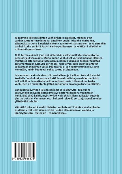Tapaamme jälleen Eläinten vanhainkodin asukkaat. Mukana ovat vanhat tutut herrasmieskoira, aatelinen vuohi, ikivanha kilpikonna, tähtijuoksijaruuna, karjalaiskalkkuna, ravintoloitsijasimpanssi sekä tietenkin vanhainkodin emäntä Strutsi Karhu-puolisoineen ja keittiössä vilistävine rottakokkiapulaisineen.Tällä kertaa eläimet joutuvat lähtemään evakkomatkalle vanhainkodin peruskorjauksen ajaksi. Mutta minne vanhukset voisivat mennä? Eläinten miettiessä tätä sattuma tulee apuun. Karhun velipoika Merikarhu jättää testamentissaan Karhulle perinnöksi rahtilaivan, jolla eläimet lähtevät seilaamaan maailman vesiä. Päämäärää ei sen kummemmin ole, sinne mennään, mihin kuono tai nokka sattuu osoittamaan.Laivamatkasta ei tule aivan niin rauhallinen ja idyllinen kuin aluksi voisi kuvitella. Vanhukset joutuvat kaikkiin mahdollisiin ja mahdottomiinkin seikkailuihin. Ja matkalta tarttuu mukaan uusia tuttavuuksia, koska vanhusten on mahdotonta jättää auttamatta pulaan joutuneita eläimiä Vanhuksilta kysytään jälleen hermoja ja kestävyyttä, sillä vanha arkkivihollinen Korppikotka ilmestyy kostonhimoisena vaanimaan heitä. Eikä siinä kaikki, myös Hylkiö-Hai sekä Sisilian saalistajat vetävät pinnaa tiukalle. Vanhukset ovat kuitenkin sitkeää sorttia ja apuakin tulee yllättävältä taholta. Väittääkö joku, että vauhti hidastuu vanhetessa? Eläinten vanhainkodin asukkaat eivät usko siihen, koska heidän elämässään on vauhtia ja jännitystä sekä tietenkin romantiikkaa