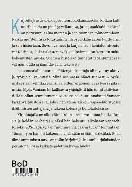 Kirjailija asui koko lapsuutensa Kotkansaarella. Näissä muistelmissa tutustumme Kotkan saareen,kulttuuriin ja historiaan. Torkkelin ja Heikkilän suvun vaiheet ja karjalaisten kohtalot nivoutuvat toisiinsa ja karjalaisten evakkotaipaleesta on kerrottu sukukokemusten myötä. Suomen historian tunnetut tapahtumat saavat näin uutta ja jännittävää viitekehystä. Kirja on myös erityisen hieno matkakertomus Kangasniemestä ja Hankasalmesta sekä Håkanbölen kartanosta Vantaan Hakunilasta.