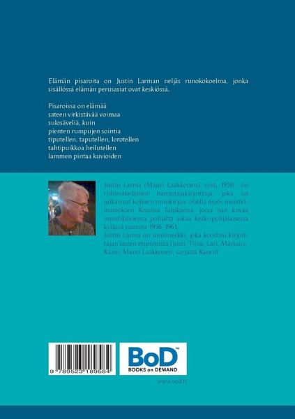 Elämän pisaroita on Justin Larman neljäs runokokoelma, jonka sisällössä elämän perusasiat ovat keskiössä. Pisaroissa on elämää sateen virkistävää voimaa sulosäveliä, kuin pienten rumpujen sointia tiputellen, taputellen, lorotellen tahtipuikkoa heilutellen lammen pintaa kuvioiden