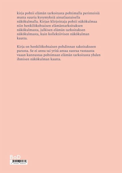 kirja pohtii elämän tarkoitusta pohtimalla perinteisiä mutta suuria kysymyksiä ainutlaatuisella näkökulmalla. Kirjan klirjoittaja pohtii näkökulmaa niin henkilökohtaisen elämäntarkoituksen näkökulmasta, julkisen elämän tarkoituksen näkökulmasta, kuin kollektiivisen näkökulman kautta. Kirja on henkilökohtaisen pohdinnan takoitukseen parasta. Se ei anna tai yritä antaa suoraa vastausta vaaan kannustaa pohtimaan elämän tarkoitusta yhden ihmisen näkökulman kautta.