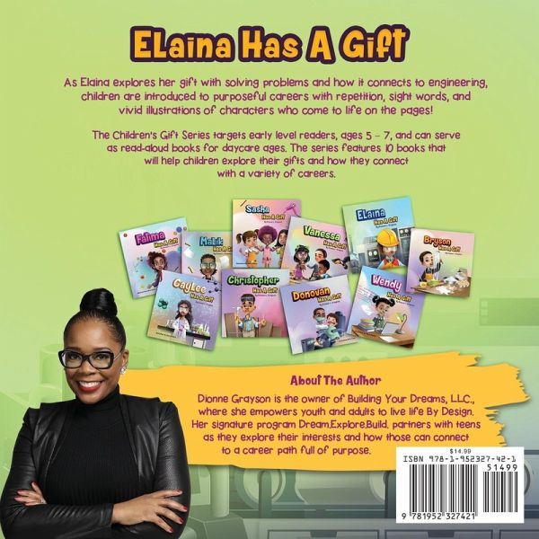 As Elaina explores her gift with solving problems and how it connects to engineering, children are introduced to purposeful careers with repetition, sight words, and vivid illustrations of characters who come to life on the pages! The Children's Gift Series targets early level readers, K - 2 grade and can serve as read-aloud books for daycare ages. The series features 10 books that help children explore gifts and how they connect with a variety of attainable careers. From baking and styling hair, to writing and working with animals, this series partners with children as they are learning to read and challenges each young mind to comprehend how unique his or her gift is. Repetition across all 10 books builds confidence with children and encourages reading.