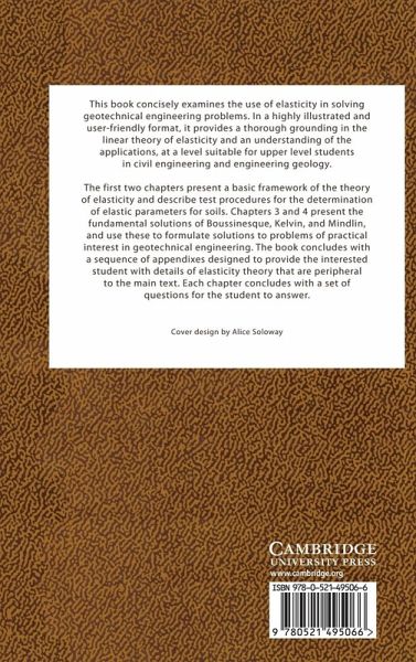 This book concisely examines the use of elasticity in solving geotechnical engineering problems. In a highly illustrated and user-friendly format, it provides a thorough grounding in the linear theory of elasticity and an understanding of the applications, at a level suitable for upper level students in civil engineering and engineering geology. The first two chapters present a basic framework of the theory of elasticity and describe test procedures for the determination of elastic parameters for soils. Chapters 3 and 4 present the fundamental solutions of Boussinesque, Kelvin, and Mindlin, and use these to formulate solutions to problems of practical interest in geotechnical engineering. The book concludes with a sequence of appendixes designed to provide the interested student with details of elasticity theory that are peripheral to the main text. Each chapter concludes with a set of questions for the student to answer.