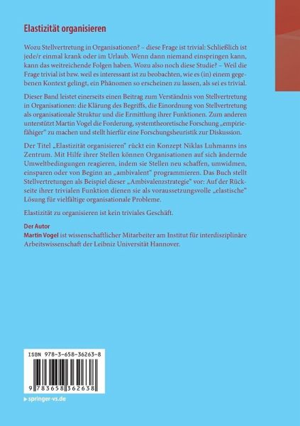 Der Titel "Elastizität organisieren" rückt ein Konzept Niklas Luhmanns ins Zentrum. Mit Hilfe ihrer Stellen können Organisationen auf sich ändernde Umweltbedingungen reagieren, indem sie Stellen neu schaffen, umwidmen, einsparen oder von Beginn an "ambivalent" programmieren. Das Buch stellt Stellvertretungen als Beispiel dieser "Ambivalenzstrategie" vor: Auf der Rückseite ihrer trivialen Funktion dienen sie als voraussetzungsvolle "elastische" Lösung für vielfältige organisationale Probleme.
