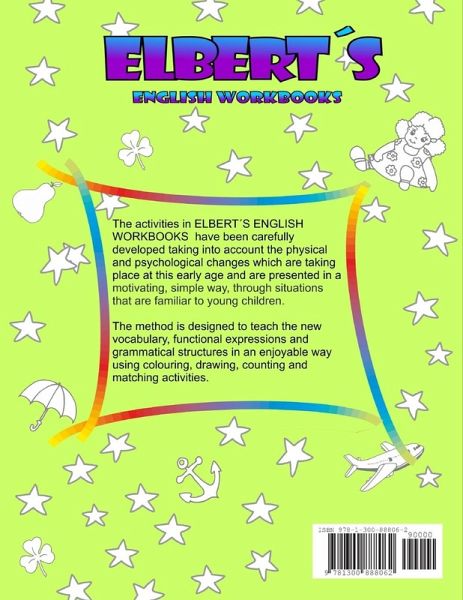 Full colour pages with over 118 activies. ELBERT¿S ENGLISH WORKBOOKS Level 1 can be used for teaching Primary children aged 5 - 6 who are learning English for the first time. The new vocabulary, expressions and structures are taught in an enjoyable way making it easy for the child to be the main protagonist.The activities involve the fine motor skills such as pre-writing, drawing and colouring.ESL,EAL,EFL workbooks.